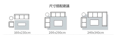 大多數客廳地毯都有標準尺寸,建議可以用這個圖的概念測量,從標準尺寸裡選擇。一般而言,三人座的沙發,地毯建議至少選擇160*230cm的大小,