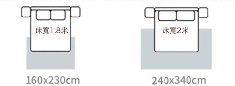 臥室地毯可以鋪在床舖下,一樣也是覆蓋床尾兩隻腳,三邊露出一部分面積,感覺就是用臥室地毯環繞床的三邊(左右跟床尾),讓雙腳不至於下床的時候踩在冰冷的地板上。左右兩邊如果還有其他家具,可以讓寬度覆蓋到傢俱前腳,或者如果臥室比較大,可以將臥室地毯延伸到落地窗/陽台/牆壁前。一般而言,1.8米的床大約需要160*230cm的臥室地毯。
