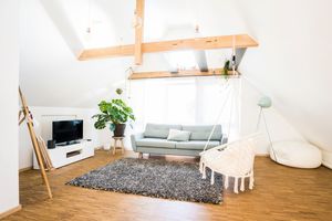 靠牆傢俱的前腳在客廳地毯上,利用地毯劃分出客廳的空間範圍