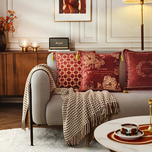 本款抱枕套設計取材自燈籠花,有「幸福美滿」的寓意,用現代時尚的手法,對喜慶美學做了年輕化的詮釋,讓傳統的燈籠花圖案顯得更加唯美,有放鬆的美感。整套抱枕套有著飽滿的復古酒紅色,宛如紅酒倒入杯中,圓潤滿盈的設計感帶著圓滿的祝福,獻給每一位懂得生活、懂得愛與儀式感的人。