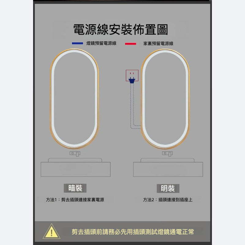 • 燈鏡安裝可使用插座(插座不可被鏡子擋住),也可接暗線(鏡子懸掛處需預留出線口)。