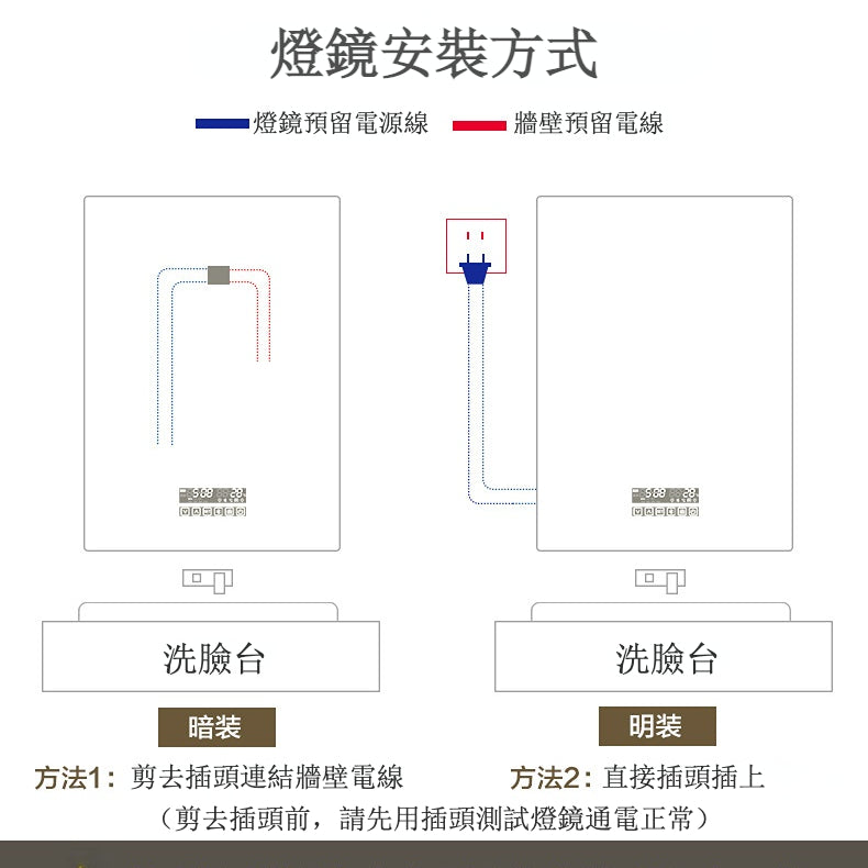 • 燈鏡安裝可使用插座(插座不可被鏡子擋住),也可接暗線(鏡子懸掛處需預留出線口)。